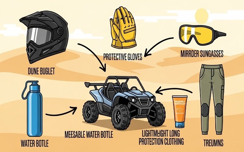 Wear a helmet, gloves, and sunglasses. Bring sunscreen, water, and comfortable clothing suitable for sand and sun.